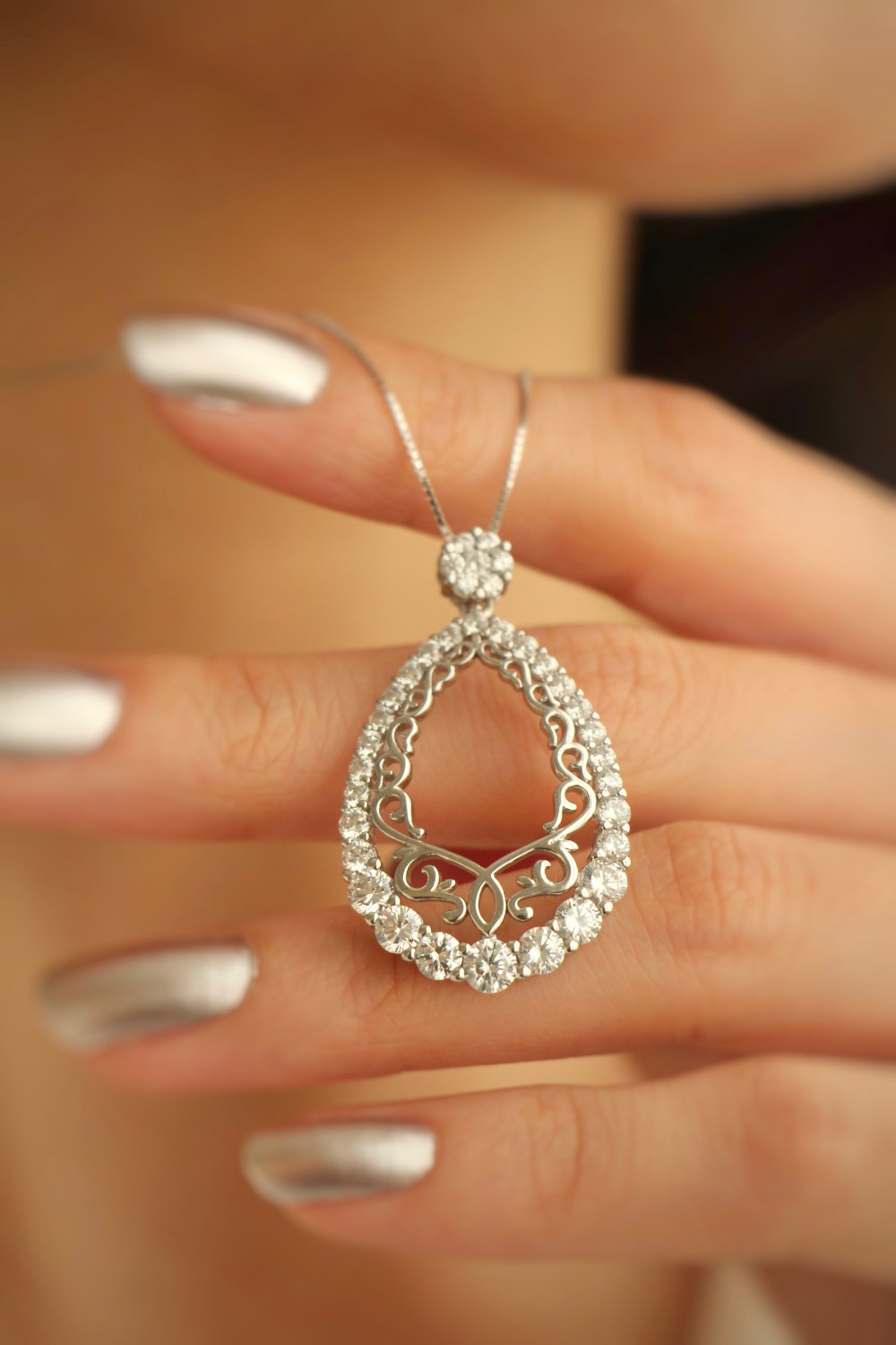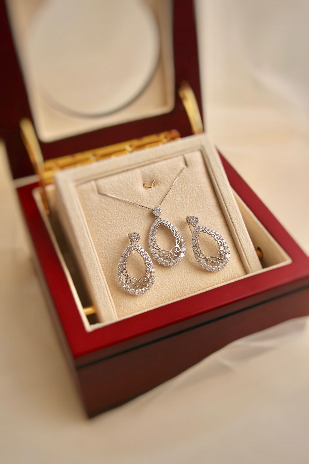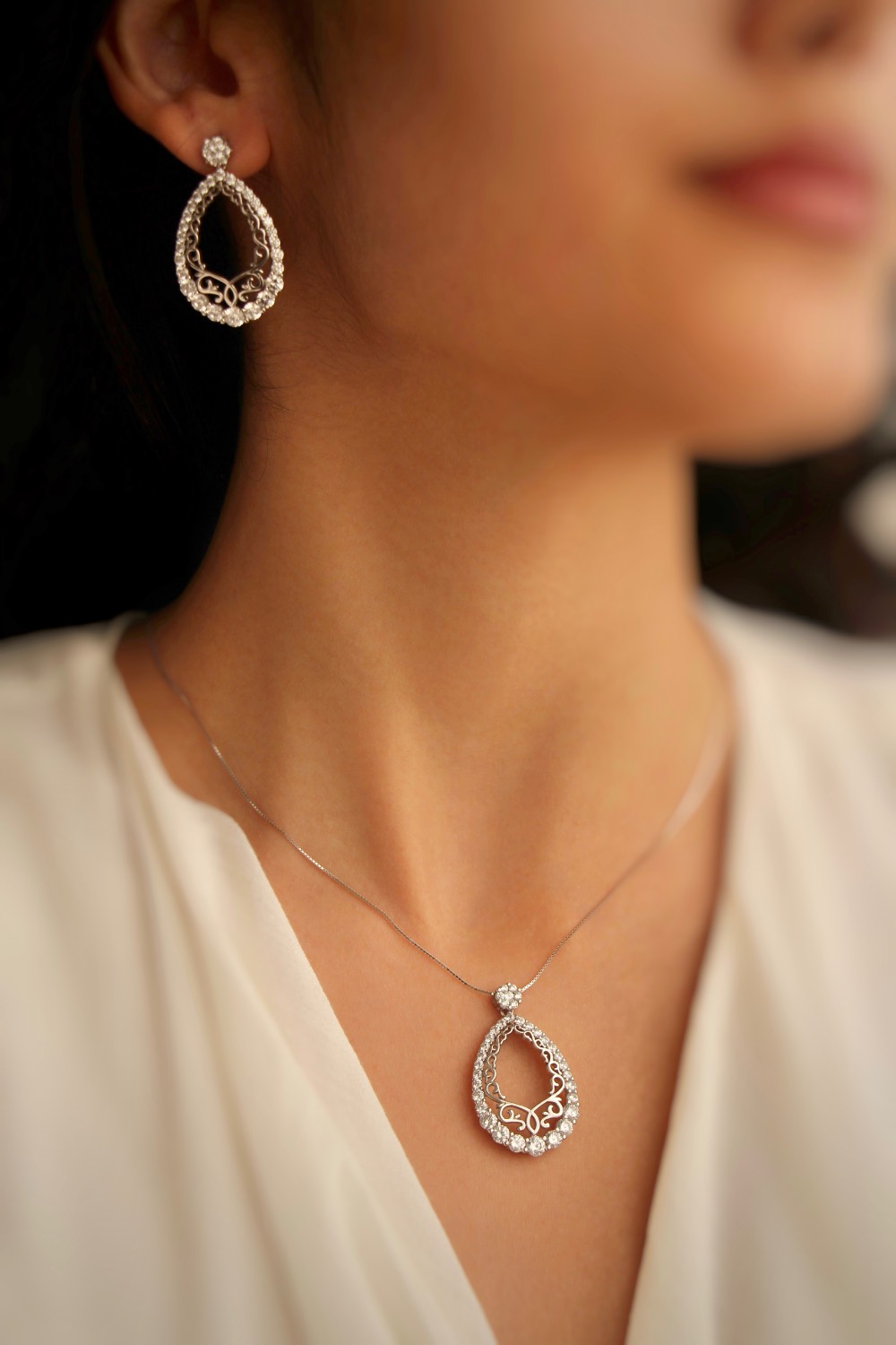 این سرویس نقره با طراحی اشکی، ترکیبی بینقص از ظرافت و درخشش است. نگینکاری دقیق در کنار فرم کشیدهی آویز، باعث میشود گردن کشیدهتر و استایل شیکتر دیده شود. هماهنگی کامل گردنبند و گوشوارهها، این سرویس را به انتخابی ایدهآل برای مراسم رسمی، مهمانیها و حتی استایل عروس تبدیل کرده است.