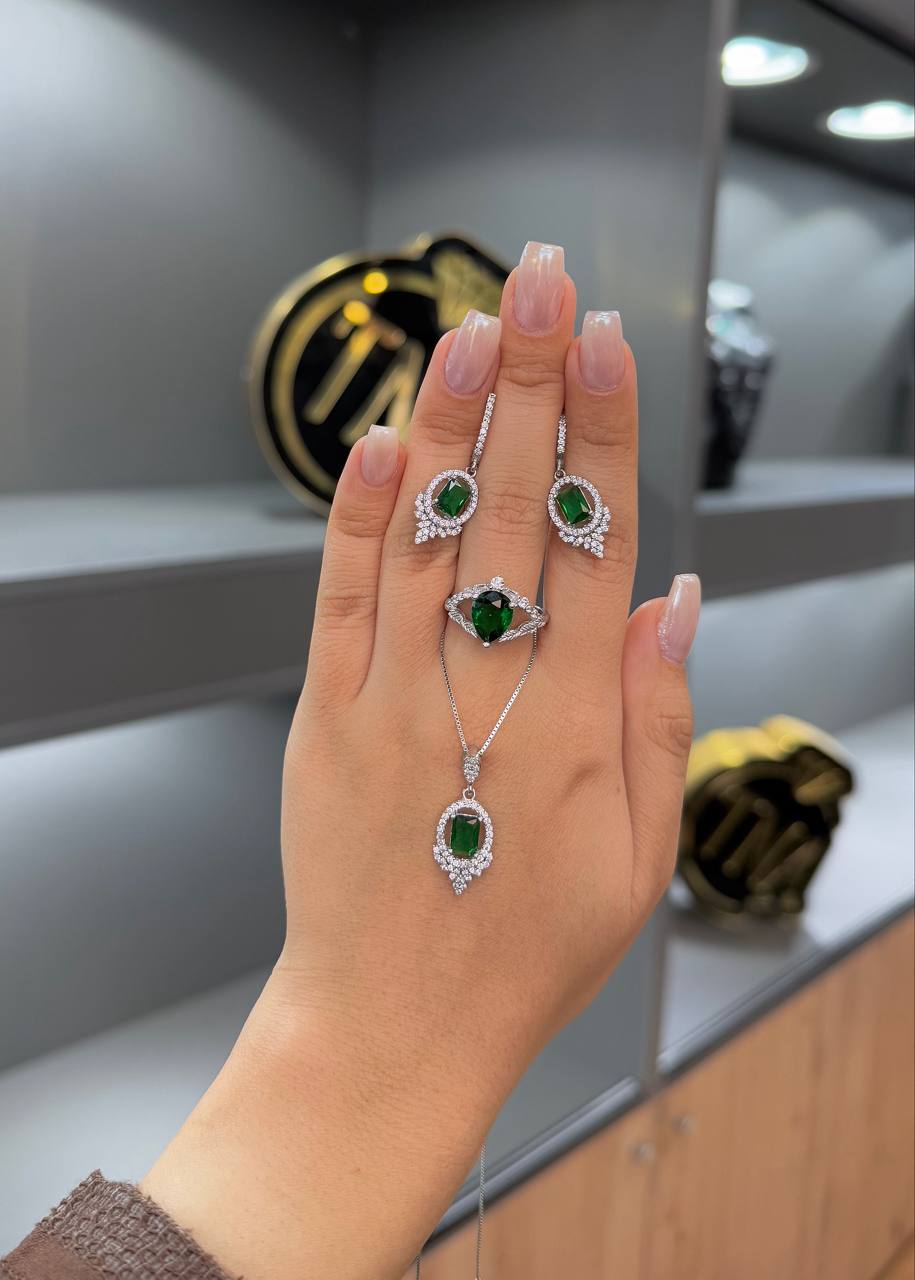 این نیمست نقره زنانه با الهام از زیبایی سنگ زمرد طراحی شده و شامل گردنبند وانگشتر و گوشوارههایی ظریف و درخشان است. ترکیب نقره ۹۲۵ با آبکاری رادیوم (طلا سفید) جلوهای لوکس و مدرن به کار بخشیده و درخششی مشابه طلا سفید ایجاد میکند. نگینهای طرح زمرد با رنگ سبز خاص خود، حس اصالت، انرژی مثبت و شادابی را منتقل میکنند و استایلی جذاب و متفاوت برای بانوان خوشسلیقه میسازند.