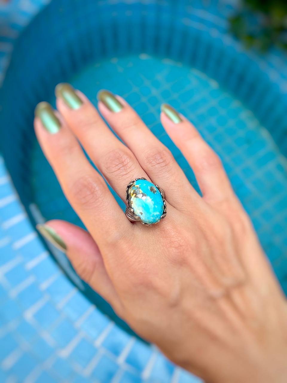 نگین اصلی این انگشتر، فیروزه اصل نیشابور است که به رنگ آبی روشن و خاص خود شهرت جهانی دارد. فیروزه علاوه بر زیبایی، در فرهنگ ایرانی نماد خوشبختی، آرامش و انرژی مثبت است. بسیاری از افراد باور دارند که فیروزه خواص درمانی داشته و موجب افزایش اعتمادبه‌نفس و آرامش روحی می‌شود.