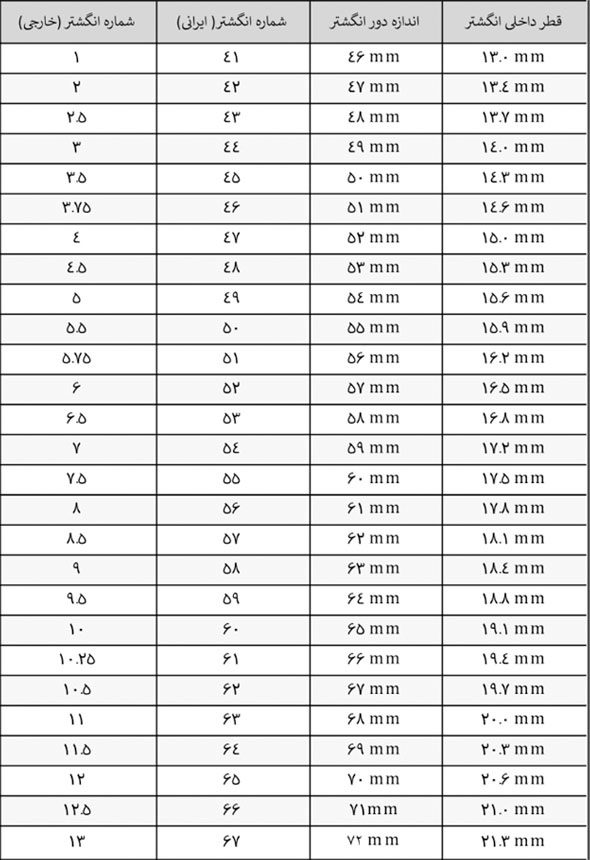 و با استفاده از جدول زیر سایز انگشتر خود را بدست آورید.