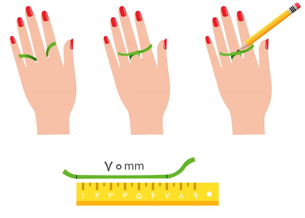 زمان اندازهگیری: بهتر است اندازهگیری سایز انگشتررا در پایان روز انجام دهید، زیرا در طول روزانگشتها ممکن است کمی متورم شوند.