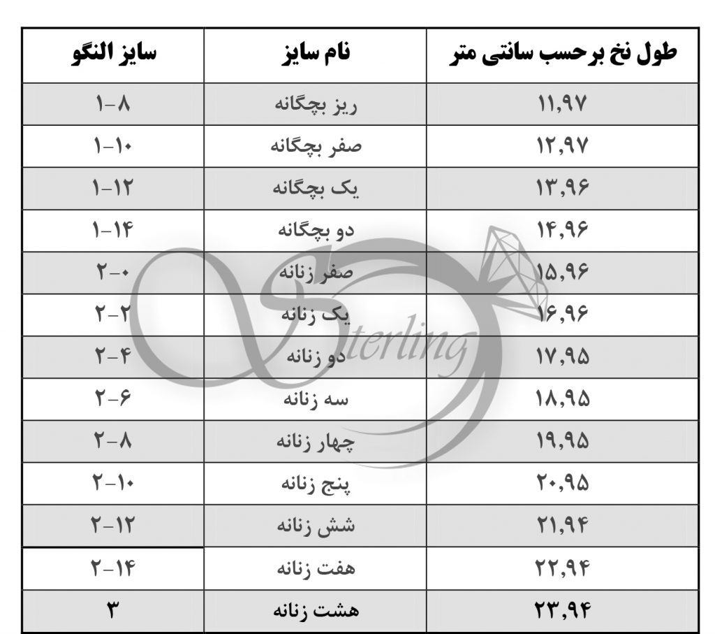 ج) با استفاده از جدول زیر و طول نخ بدست آمده سایز مناسب برای النگوی خود را میتوانید بدست آورید.